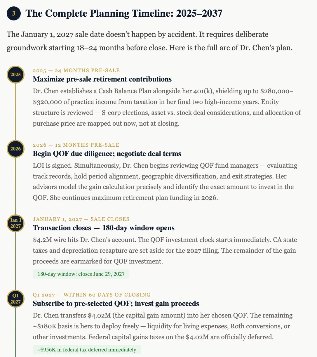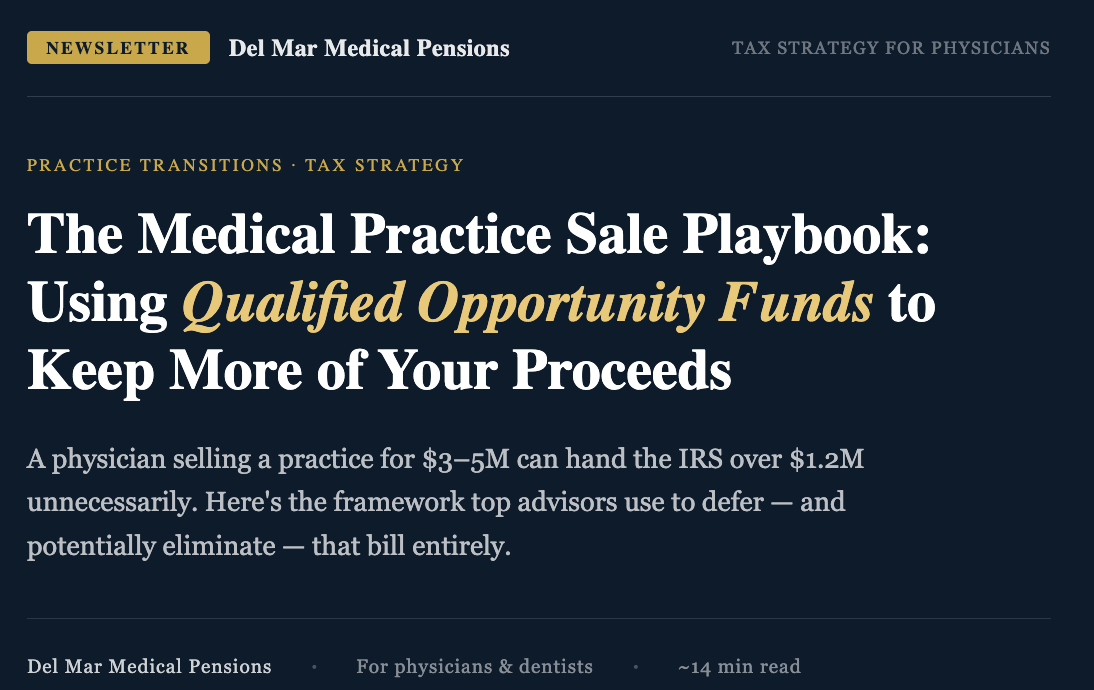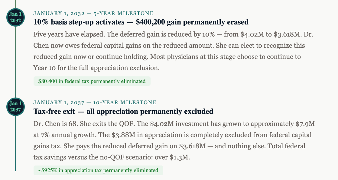 Qualified Opportunity Funds (QOFs) are among the most powerful tools available to physicians selling a practice. And for doctors who can time their sale to January 1, 2027, the combination of a 5-year deferral, a step-up in basis, and a 10-year appreciation exclusion creates a tax outcome that simply cannot be replicated with any other single strategy.