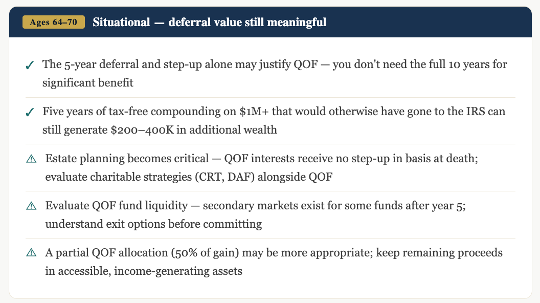Legislative note: The QOF program's original deferral window closes December 31, 2026 for investments to qualify for the 5-year step-up. This article models a January 1, 2027 sale under anticipated QOF legislation renewal — a provision with strong bipartisan support that many tax practitioners expect Congress to extend as part of broader tax legislation. Your advisor should confirm current law before executing. All scenarios below assume renewed QOF provisions on terms substantially similar to the original program.