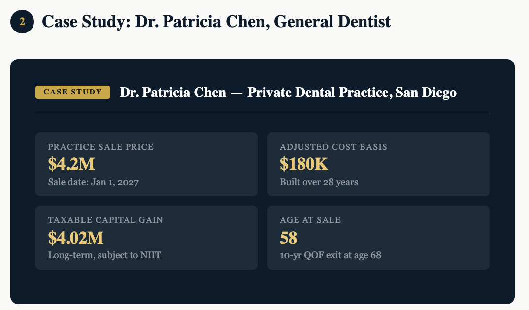 Dr. Chen’s $4.02M capital gain faces a brutal effective tax rate: 20% federal long-term capital gains + 3.8% NIIT + California’s 13.3% state rate. That’s a blended rate approaching 37% — or roughly $1.49M owed if she does nothing.