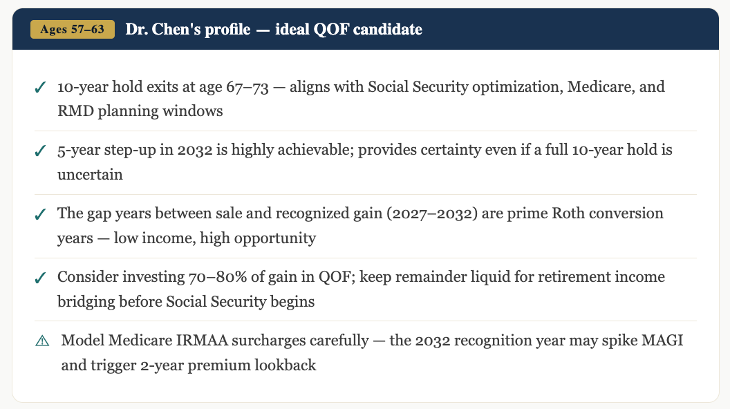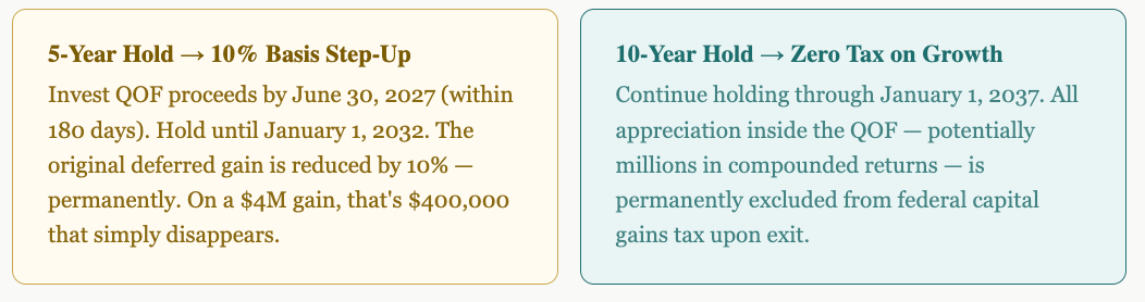 Not all QOF timing is equal. The program has always rewarded patience — specifically, investors who hold long enough to unlock each successive benefit tier. A January 1, 2027 sale positions Dr. Chen to access all three benefit layers simultaneously.