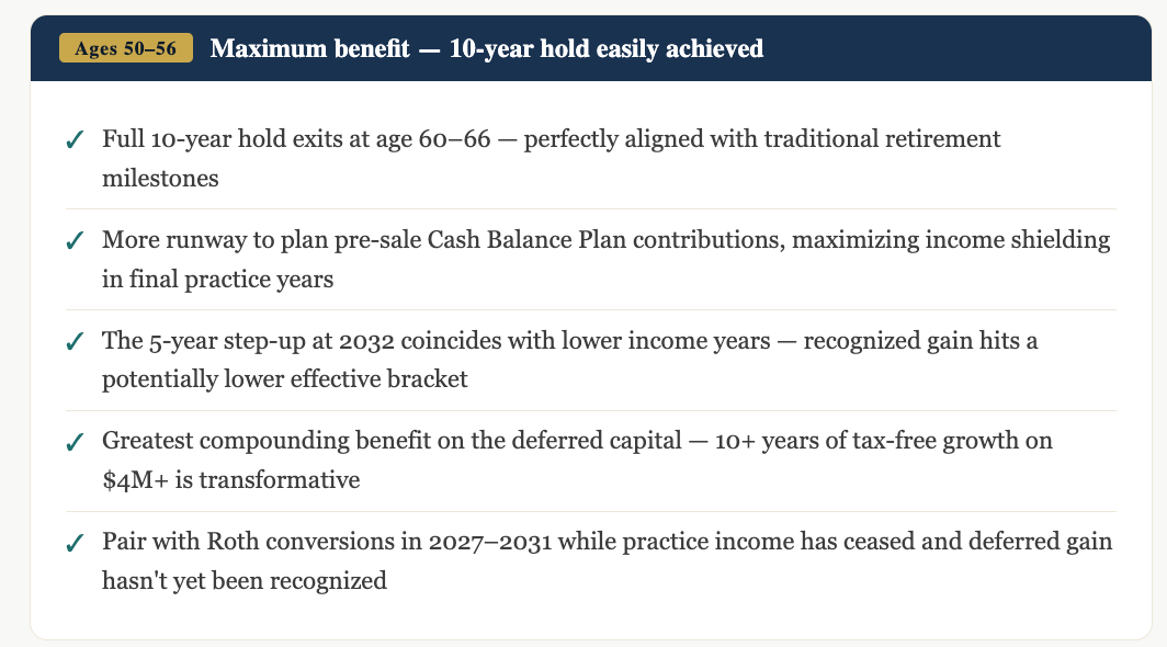 The 5-year step-up is particularly significant. Unlike most tax benefits that merely delay the inevitable, this one permanently reduces the taxable gain. Combined with five years of tax-free compounding on capital that would otherwise have gone to the IRS, the January 1, 2027 timing is the optimal entry point for a doctor in their late 50s.
