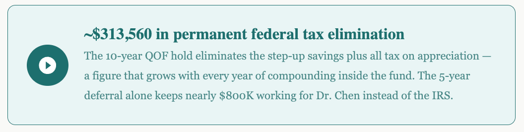 By investing her gain proceeds into a QOF within 180 days of closing, Dr. Chen activates the full three-tier benefit stack. Here’s how the numbers compare across three scenarios:
