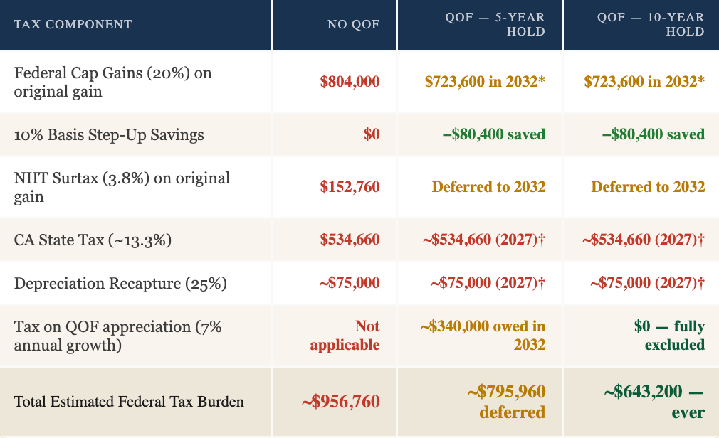 *Deferred federal gain recognized at 5-year mark (2032), reduced by 10% step-up. †California does not conform to federal QOF deferral; CA state taxes and depreciation recapture are generally owed in the year of sale. QOF appreciation modeled at 7% annual growth over 10 years on $4.02M invested. All figures illustrative; individual results will vary.